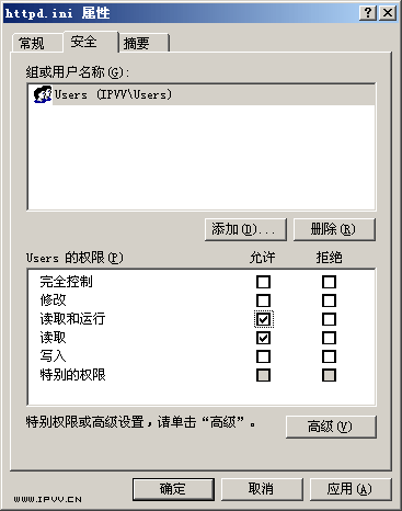 解决方法:相当简单给网站根目录下的httpd.ini文件USER用户的读取和运行权限即可。