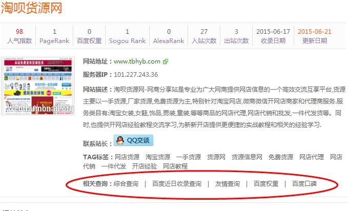 <li><strong>相关查询:</strong><a href="http://seo.chinaz.com/?host={#$web.web_url#}" target="_blank">综合查询</a> | <a href="http://tool.chinaz.com/baidu/?wd={#$web.web_url#}" target="_blank">百度近日收录查询</a> | <a href="http://check.links.cn/checklink.asp?weburl={#$web.web_url#}" target="_blank">友情查询</a> | <a href="http://mytool.chinaz.com/baidusort.aspx?host={#$web.web_url#}" target="_blank">百度权重</a> | <a href="http://koubei.baidu.com/s/{#$web.web_url#}" target="_blank">百度口碑</a></li>