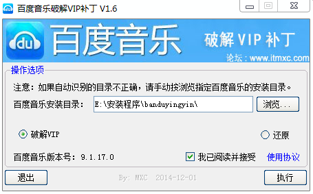 安装百度音乐客户端之后再打开此VIP补丁,打补丁时请关闭百度音乐打开后选择百度音乐客户端安装的目录,破解时会有杀毒软件报毒,放心,这不是病毒,是破解补丁强行修改百度音乐客户端的注册表,所以会报毒.