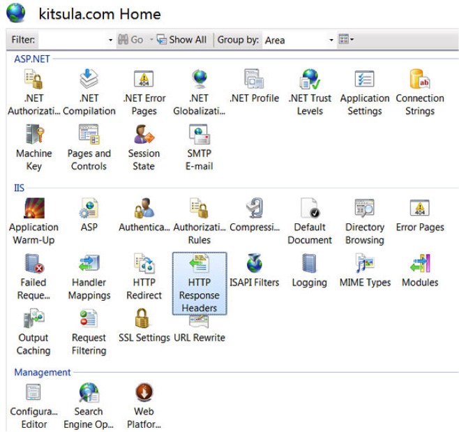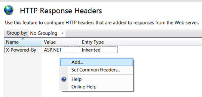 打开Internet Information Services (IIS) Manager,如图双击HTTP响应头部(HTTPResponse Headers),