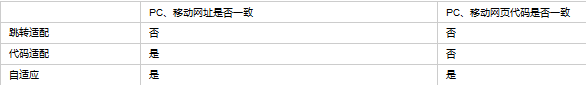 目前,PC站与移动站配置方式中有三种较为主流,百度站在搜索引擎角度将这三种分别称为跳转适配、代码适配和自适应,以下为这三种配置方式的名词解释及异同对比。