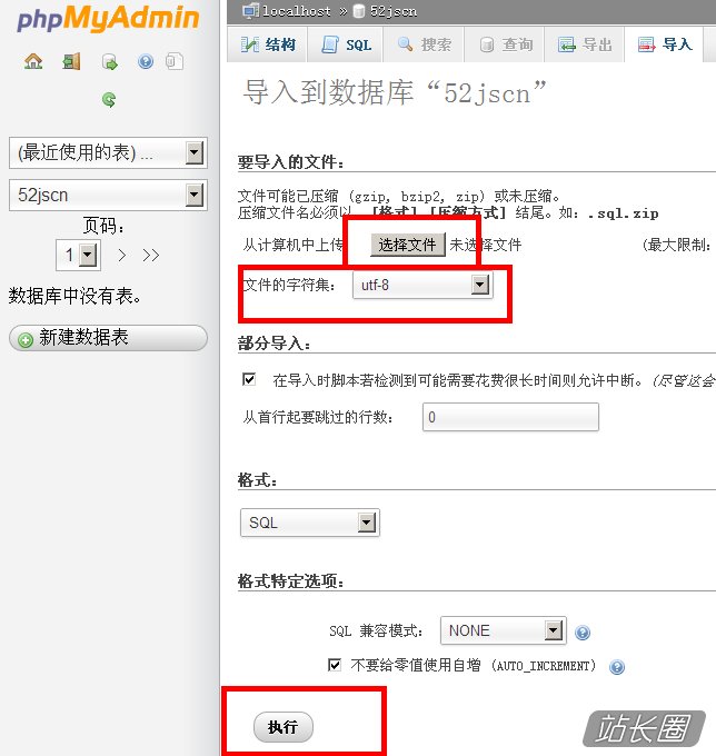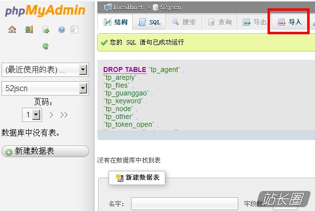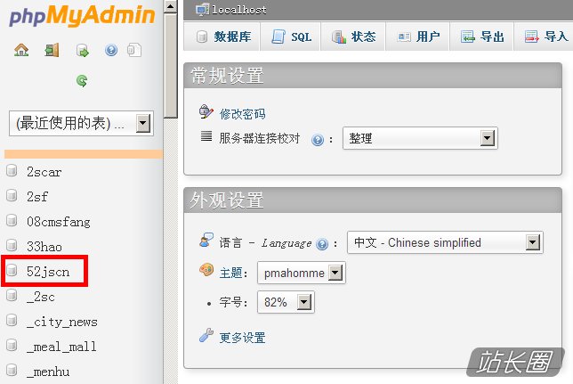 登陆phpmyadmin以后,鼠标单击左侧的数据库名称,我这里数据库名称是52jscn,但你们的不是52jscn哦。